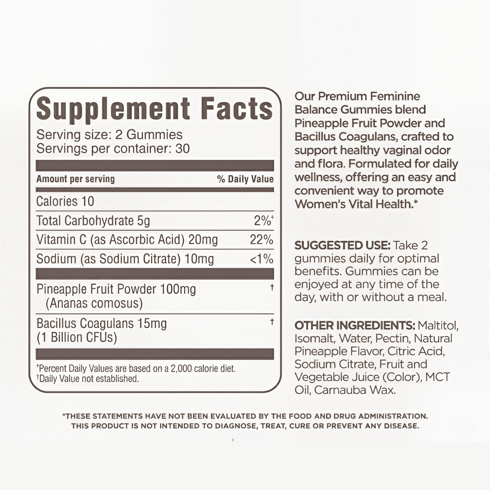 These gummies blend Pineapple Fruit Powder and Bacillus Coagulans — a clinically studied probiotic — to support healthy vaginal odor, pH balance, and immune defense. They work from within to restore your body's natural balance, simply and deliciously.
